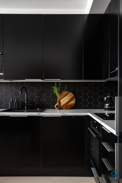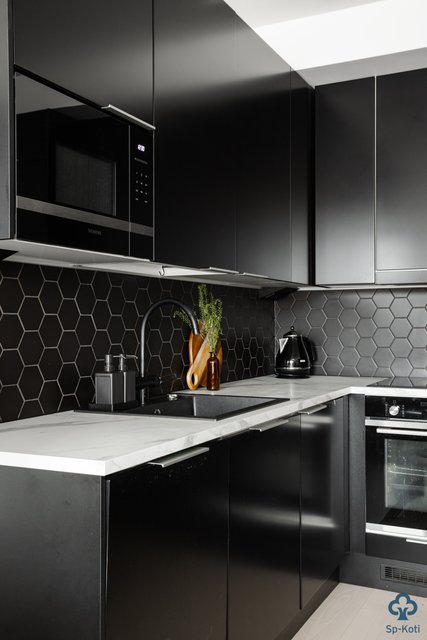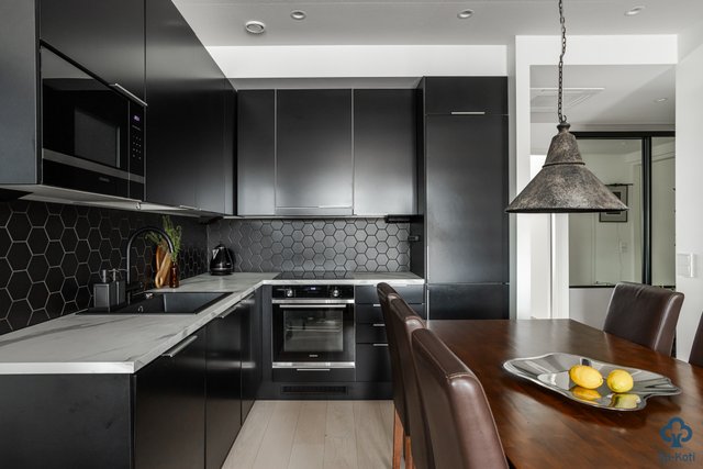- Induktioliesitaso, kalusteuuni, liesituuletin, integroitu jääkaappi/pakastin sekä astianpesukone ja integroitu mikro. Lattia tammilautaparkettia ja seinät maalattu.