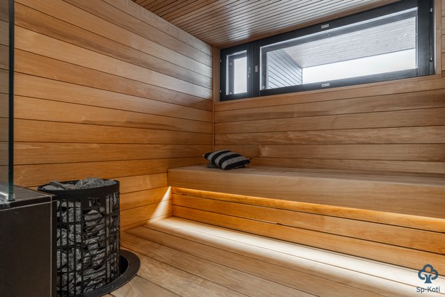 - Sähkökiuas. Saunassa ikkuna ulos.