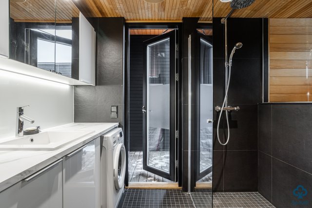 - Sadesuihku, suihkuseinä, pesuallas, pesukoneliitäntä, peili- ja allaskaapisto sekä lattialämmitys. Lattia ja seinät laattaa. Kylpyhuoneesta on kulku suoraan ulos terassille.