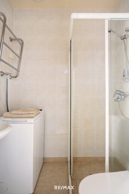 - WC-istuin, suihkuseinä, pesukone, pesukoneliitäntä, peilikaappi, ja allaskaappi