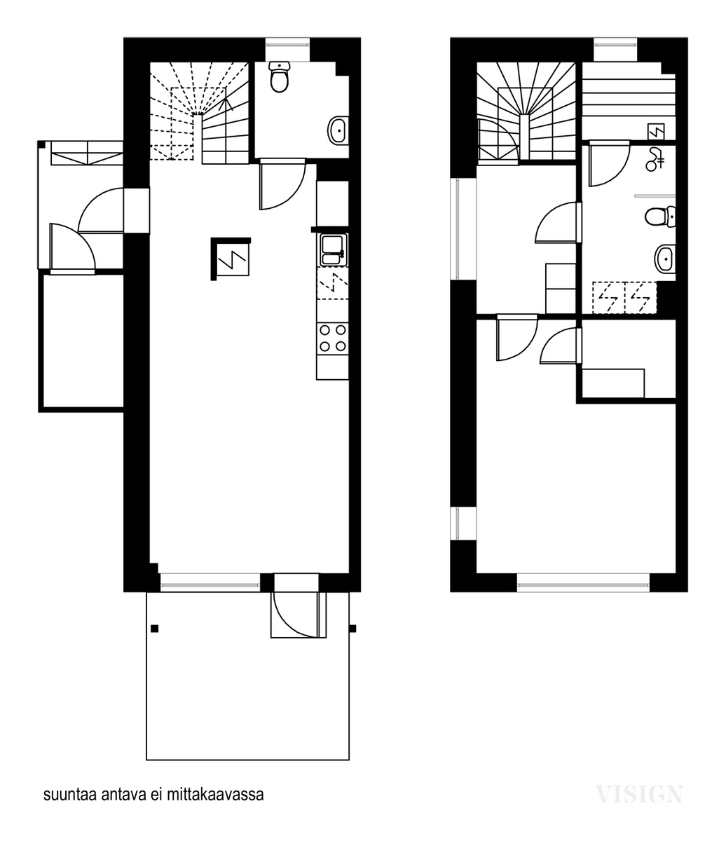 Kaunis kaksio kahdessa tasossa, pääty huoneisto. Yläkerrassa iso makuuhuone ja eteinen säilytys tiloineen sekä sauna-kylpyhuone kokonaisuus. Sisääntulo kerroksessa on avokeittiö, olohuone ja wc. Olohuoneesta pääset pienelle pihalle nauttimaan kesäisistä päivistä.