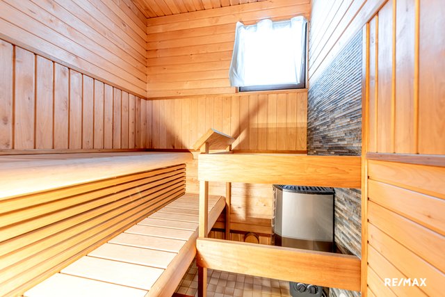 Oma sauna tarjoaa rentouttavat löylyt. Asunnossa on terassi, joka avautuu vehreälle piha-alueelle.