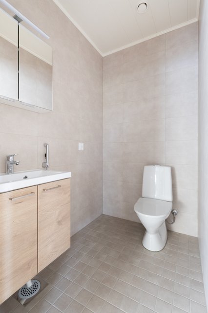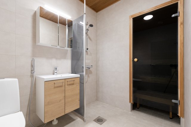 - Suihku, wc-istuin, lattialämmitys, peili, ja peilikaappi