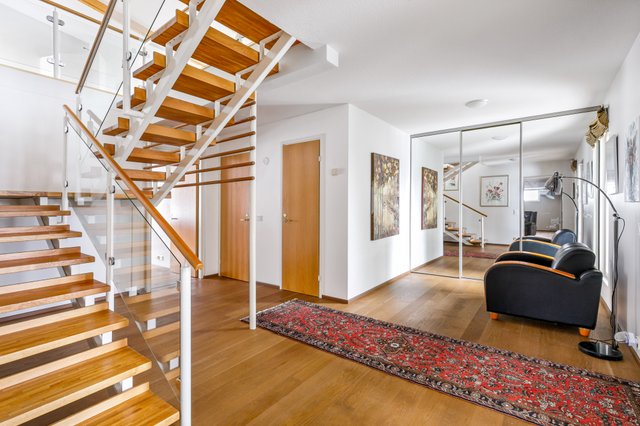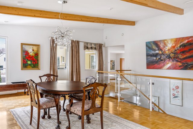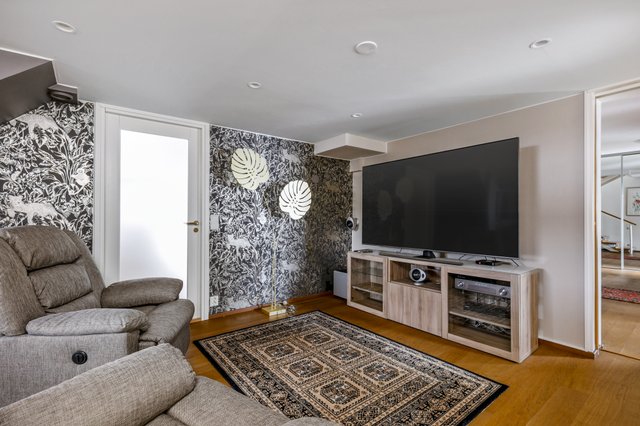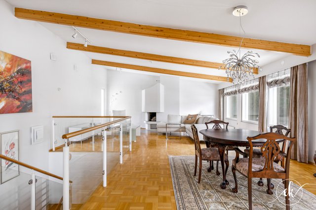 Olohuoneen korkea viistokatto ja valkoinen avotakka luovat avaruutta ja tunnelmaa. Kauniisti uusittu viininpunainen keittiö tarjoaa runsaasti kaappi- ja laskutilaa. Makuuhuoneita on neljä ja kaikissa on kaapistot, mikä helpottaa arjen sujuvuutta. Saunaosaston yhteydessä on poreamme ja saunaosastolla tähtitaivaskatto, jotka tuovat ripauksen luksusta arkeen.