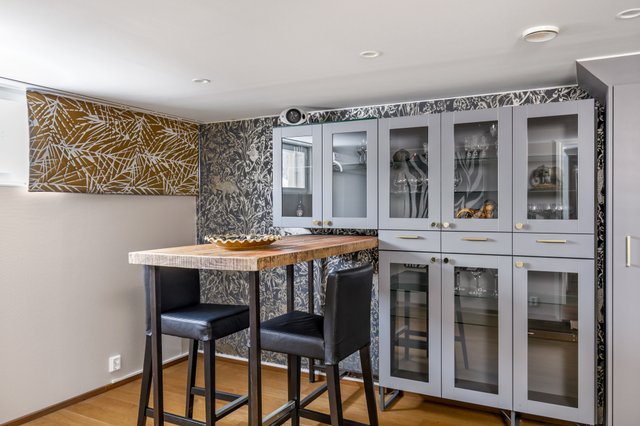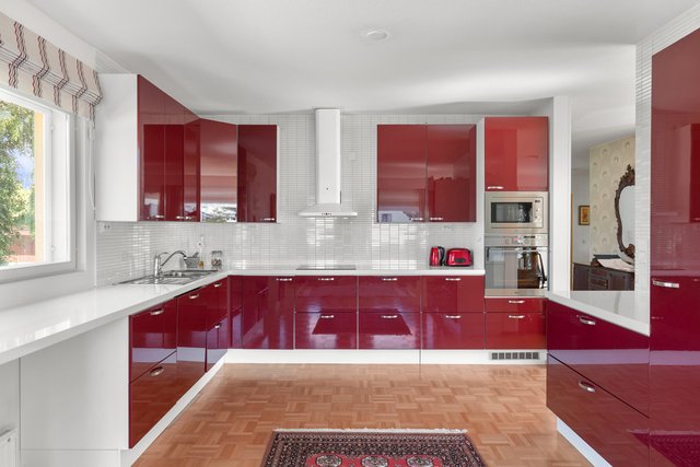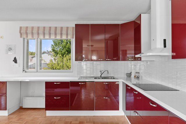 - Persoonallisen kaunis, viininpunainen keittiö on uusittu kauttaaltaan vuonna 2011. Integroitu jääkaappi ja pakastin, paljon kaapistoja ja laskutilaa, induktioliesi, erillisuuni, mikroaaltouuni. Liesituuletin hormiin. Alakerrassa on tilava kylmiö.