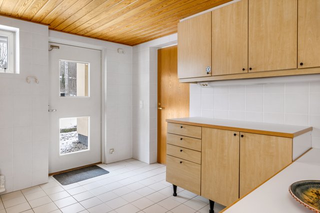 - Tilavassa kodinhoitohuoneessa on paljon säilytystilaa ja käynti pihalle.