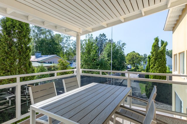 - Aurinkoinen, osin katettu puutarhaterassi tuijien suojassa.