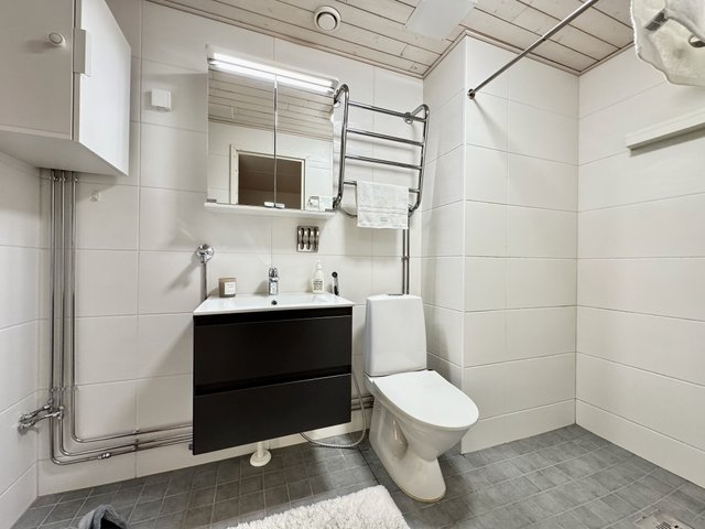 - WC-istuin, pesukoneliitäntä, lattialämmitys, peilikaappi, pesuallas, allaskaappi, ja bidee-suihku