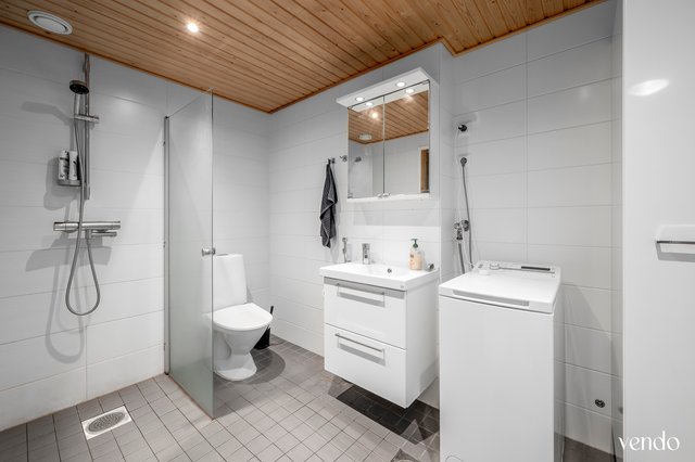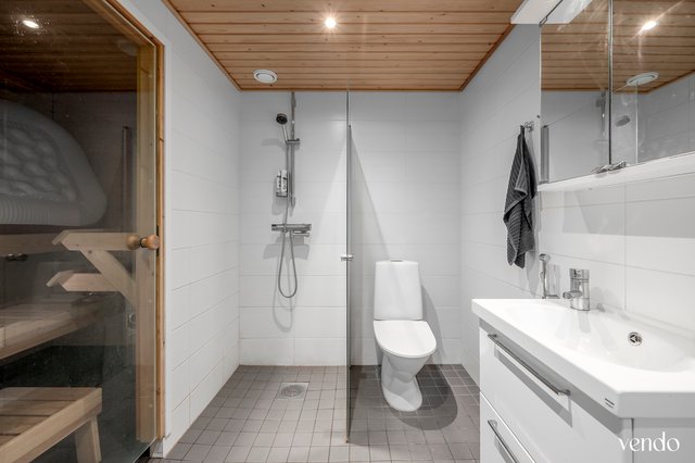 - WC-istuin, suihku, suihkuseinä, pesukoneliitäntä, lattialämmitys, peilikaappi, pesuallas, allaskaappi, ja bidee-suihku