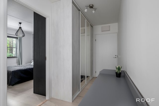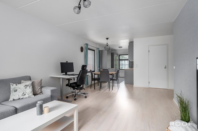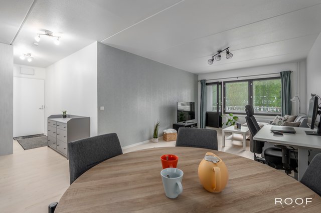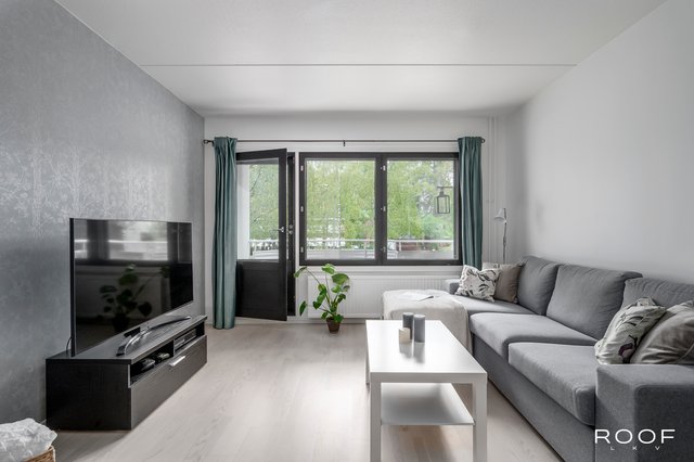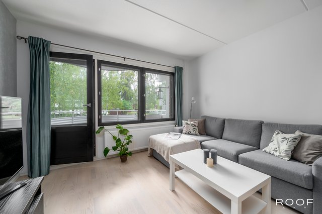 Kattavasti remontoitu koti hurmaa avaruudellaan. Eteisestä avautuu näkymä tilavaan olohuoneeseen, joka sulautuu tyylikkääseen keittiöön ruokailutilan kautta. Suuret ikkunat tuovat luonnonvalon sisään kolmesta suunnasta. Olohuoneesta on lisäksi kulku parvekkeelle, josta on vehreät näkymät pihalle ja rauhalliselle sivukadulle. Vuonna 2021 uusittu keittiö on moderni ja käytännöllinen. Samassa yhteydessä uusittiin myös asunnon pinnat ja makuuhuoneen sekä eteisen kaapistot, joten koti on muuttovalmis ja ajantasainen. Makuuhuone tarjoaa tilaa parisängylle sekä runsaasti säilytystilaa. Kylpyhuoneen yhteydessä oleva oma sauna kruunaa kokonaisuuden.