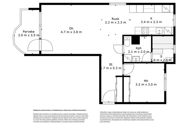 - Isännöitsijäntodistuksen mukainen, Yhtiöjärjestyksen mukainen, (Pinta-ala ei ole tarkistusmitattu ja todellinen pinta-ala voi olla suurempi tai pienempi, kuin ilmoitettu)