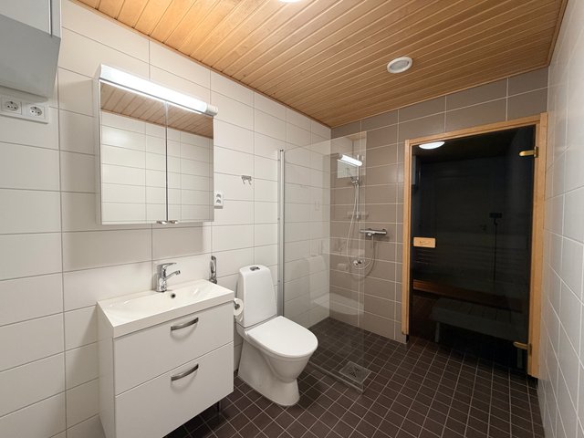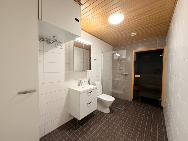 - WC-istuin, suihku, suihkuseinä, pesukoneliitäntä, lattialämmitys, peilikaappi, pesuallas, allaskaappi, ja bidee-suihku