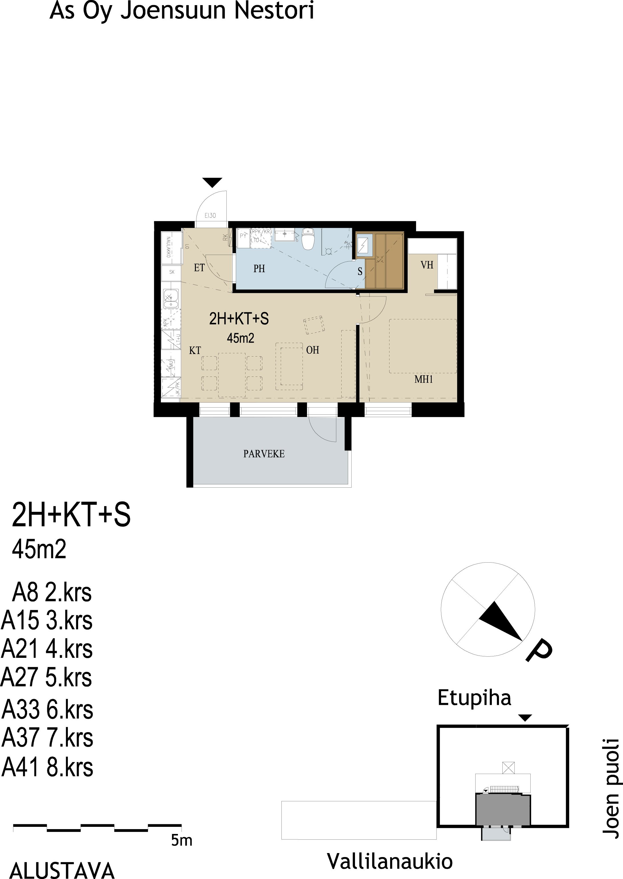 Penttilänrannan palveluiden läheisyyteen vuonna 2017 valmistuneen hissikerrostalon kolmannen kerroksen saunallinen kaksio. Huoneiston on erittäin siistikuntoinen ja neliöt on tehokkaasti käytössä. Lattiat parkettia ja seinäpinnat osin maalattu, osin tapetoitu. Vaatesäilytykseen eteisessä liukuovikomero ja makuuhuoneessa vaatehuone. Kylpyhuone kaakeloitu ja varustettu mm. lattialämmityksellä. Huoneiston lasitettu parveke ja kaikki ikkunat Vallilanaukiolle ja näkymä myös Pielisjoelle.