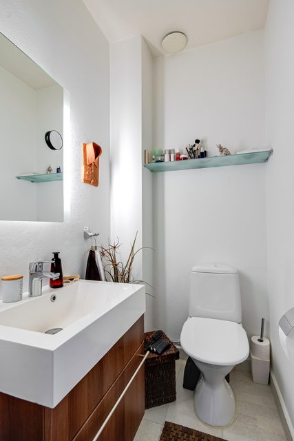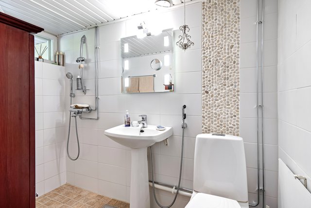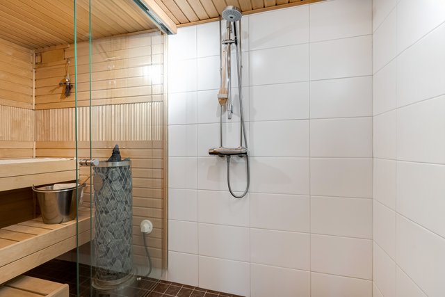- Alakerrassa: Sisääntullessa heti vasemmalla kylpyhuone. Tila on laatoitettu. Tilassa on wc-istuin, suihku, pesu-allas, peili. Tilassa on lattialämmitys. Saunan yhteydessä on pesuhuone, joka on laatoitettu. Tilassa on suihku. Tilassa on lattialämmitys.
