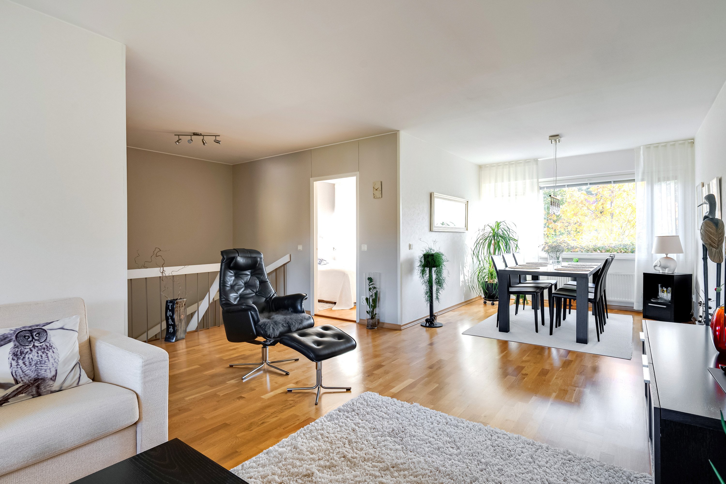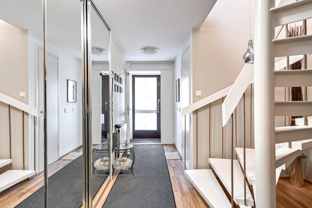 Kahteen tasoon jakautuva päätyhuoneisto, jonka yläkerrassa on keittiö, olohuone, makuuhuone, ruokailutila, wc ja lasitettu parveke. Yläkerrasta on myös kulku täydellisen yksityisyyden omaavalle takapihalle. Yläkerran ruokailutila on mahdollista muuttaa toiseksi makuuhuoneeksi.