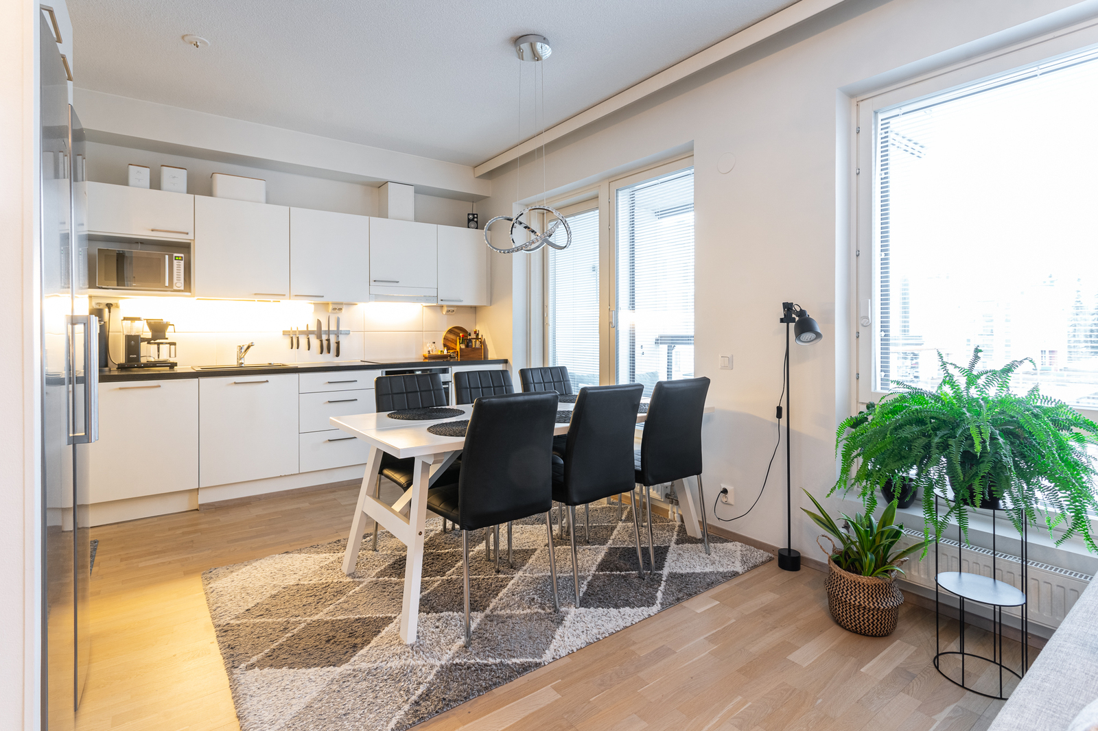 Ajanmukainen tyyli ja laadukkaat materiaalit sekä hyvin toteutettu keittiökokonaisuus kodinkoneet tuovat iloa yhdessäoloon ja kokkailuun.