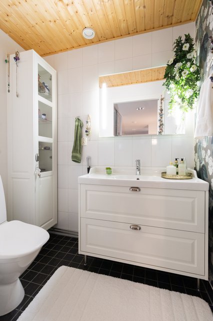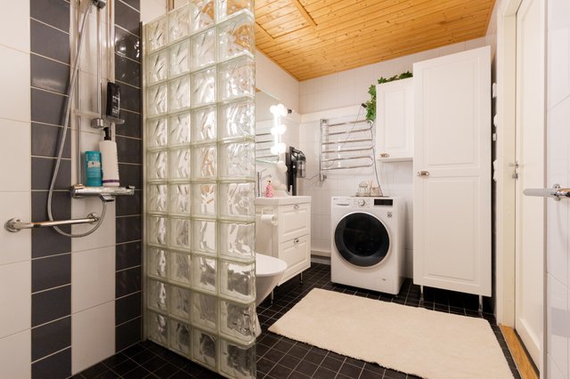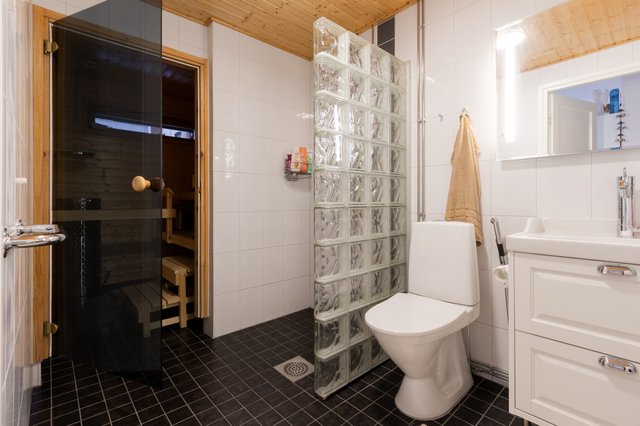 - WC-istuin, suihku, peili, allaskaappi, bidee-suihku, lattialämmitys, pesukoneliitäntä, ja suihkuseinä