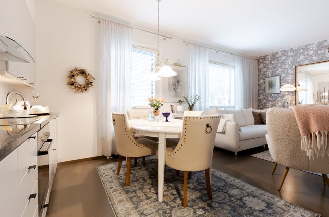 Keittiö on varusteltu modernisti kivitasoilla ja laadukkailla kodinkoneilla, ja tilava olohuone tarjoaa mukavat puitteet yhdessäoloon. Asunnossa on oma sauna ja tilava pesuhuone.