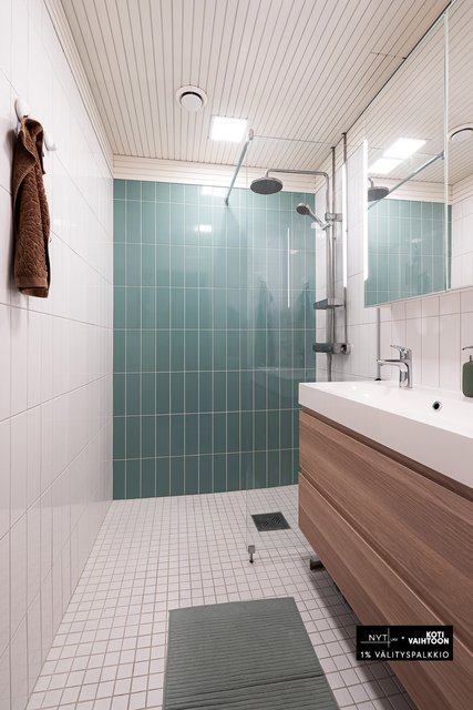 - Suihku, suihkuseinä, lattialämmitys, allaskaappi, pesuallas, ja peilikaappi