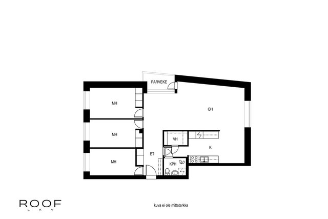 Erittäin tilava ja valoisa olohuone on tämän kodin sydän ja täällä on tilaa kokoontua koko perheen tai ystäväporukan voimin peli-iltoihin tai vaikka joulun viettoon. Olohuoneesta on kulku myös ilta-auringon suuntaan olevalle parvekkeelle. Keittiö on kaunis ja toimiva, työskentelytasot, säilytystilat sekä nykyaikaiset kodinkoneet tuovat iloa kokkailuun. Huomio! Pohjakuvassa on muutama virhe, mm. eteisestä wc:aan ja vaatehuoneeseen kulku on ilman lisäovea, korjattu tulossa pian.