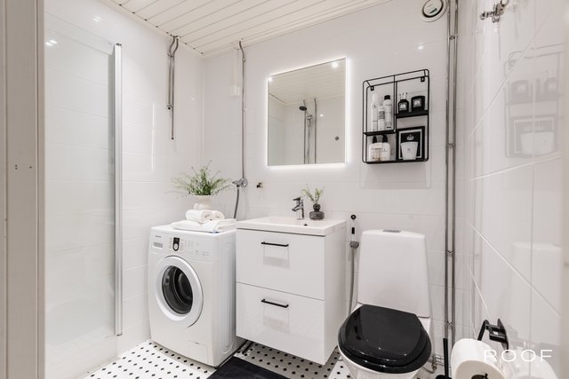 - WC-istuin, suihkuseinä, suihku, pesukoneliitäntä, lattialämmitys (sähköllä), peili (valopeili), pesuallas, allaskaappi, bidee-suihku, ja pyyhekuivain, on asentamatta (ostaja saa halutessaan asennuttaa)
