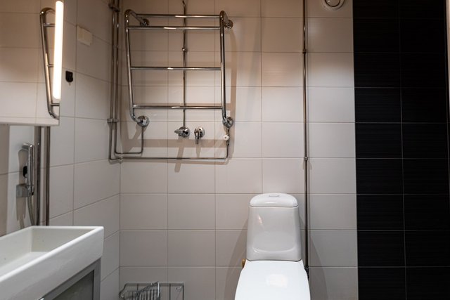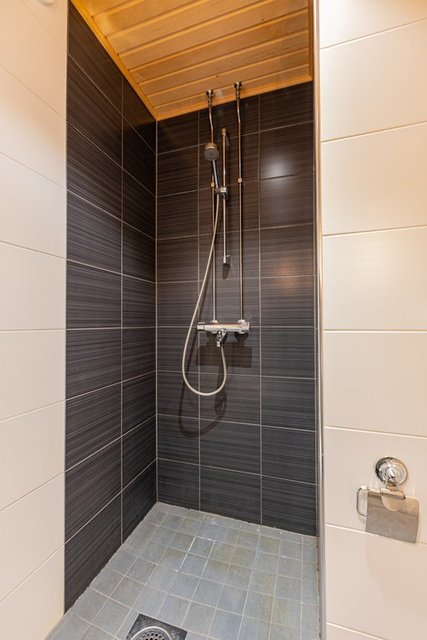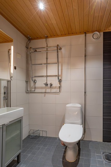 - WC-istuin, suihku, pesukoneliitäntä, peilikaappi, allaskaappi, ja pesuallas