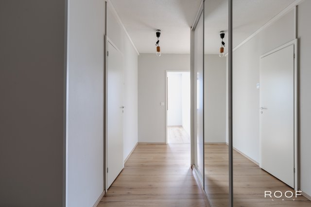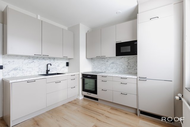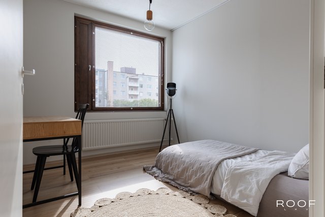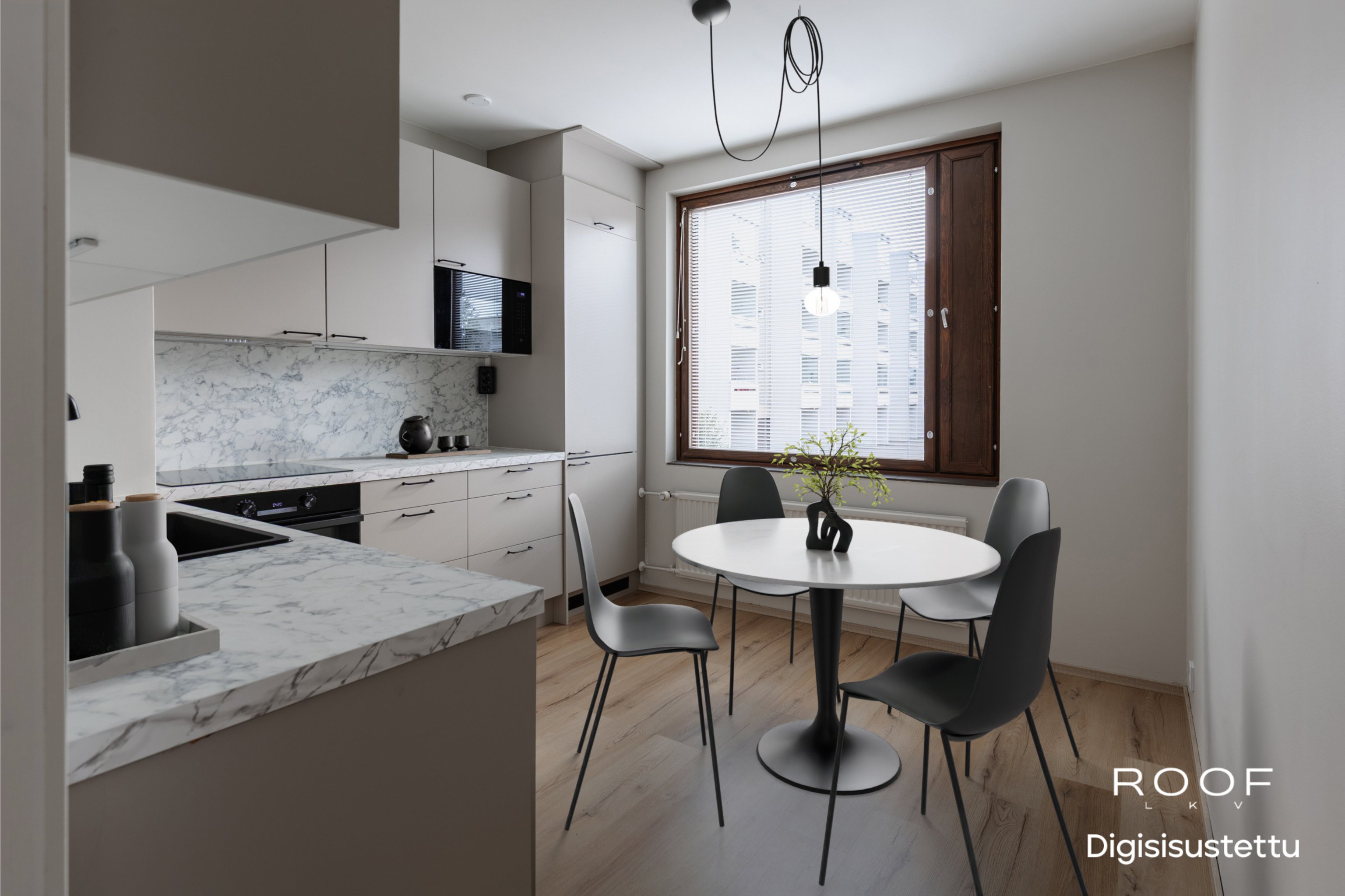 Pohjaratkaisu on käytännöllinen ja tilat avautuvat väljästi. Moderni keittiö houkuttelee kokkailemaan ja sinne mahtuu hyvin myös ruokapöytä. Olohuone jatkuu etelään avautuvalle lasitetulle parvekkeelle, joka tarjoaa tunnelmallisen lisätilan vuoden ympäri. Kaksi makuuhuonetta ja erillinen vaatehuone tekevät kodista sekä viihtyisän että toimivan.