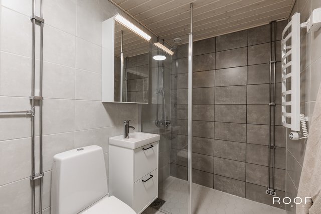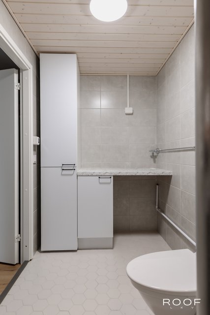 - WC-istuin, suihku, suihkuseinä, pesukoneliitäntä, lattialämmitys, allaskaappi, peilikaappi, ja kodinhoitohuoneen kaapistot, taso pyykinkäsittelylle, pyyhekuivain