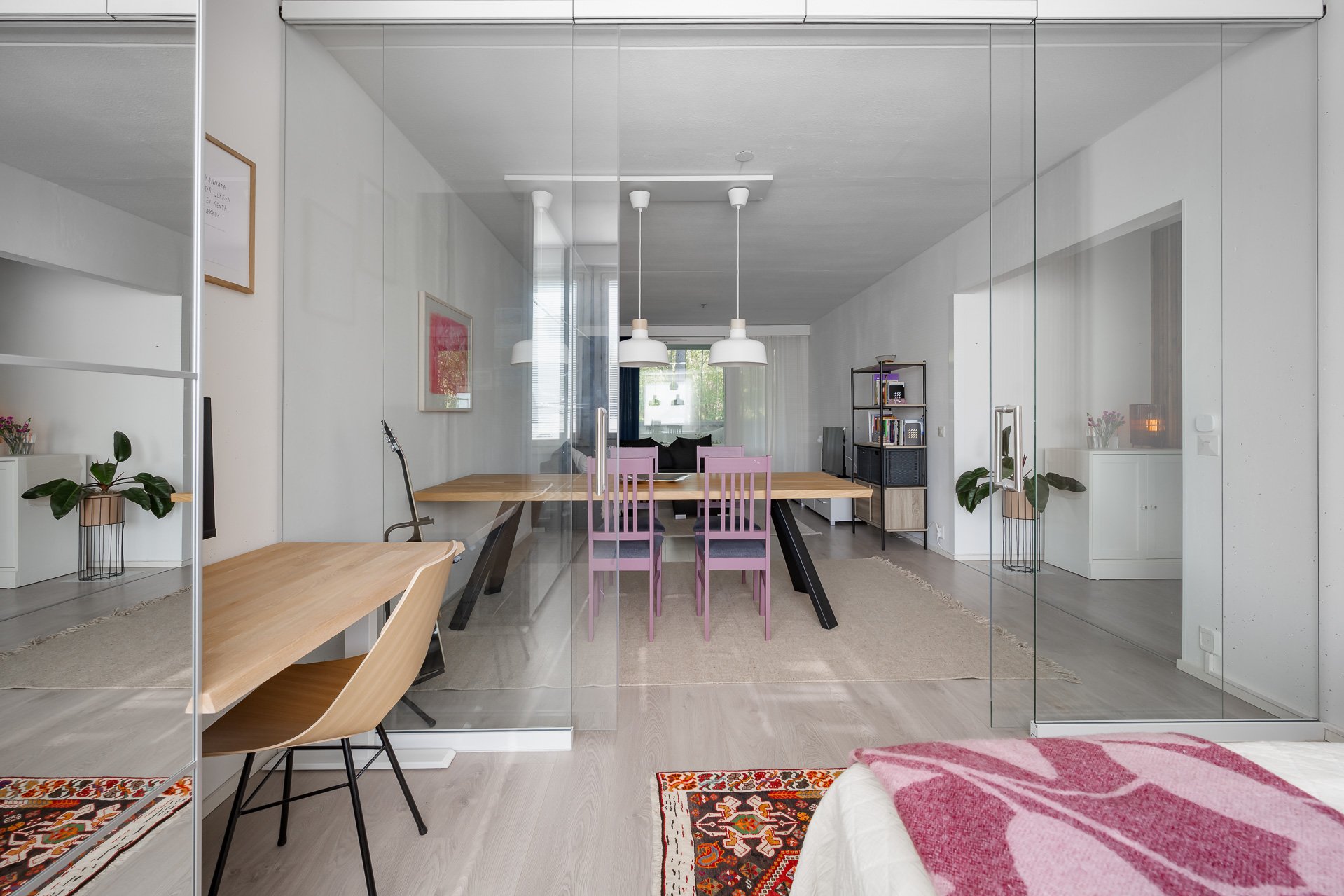 Tämä harvinaisen tilava ja valoisa 61 m² kaksio sijaitsee Turun Hannunniitussa osoitteessa Vanha Hämeentie 110. Asunto on remontoitu vuonna 2022 hyvällä maulla, ja sen erityispiirteenä on näyttävä lasiseinä, joka yhdistää tilat avaraksi kokonaisuudeksi ja tekee tästä kodista aidosti uniikin.