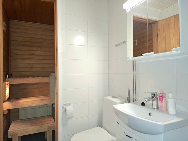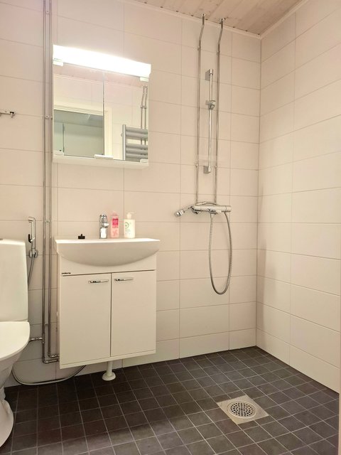 - WC-istuin, suihku, pesukoneliitäntä, pesuallas, allaskaappi, peilikaappi, ja bidee-suihku