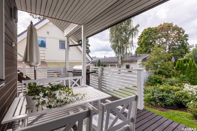- Etelänpuoleiselta terassilta avautuu vehreä takapiha, jossa on tilaa sekä grillille että isommalle ruokaryhmälle
