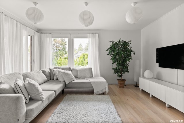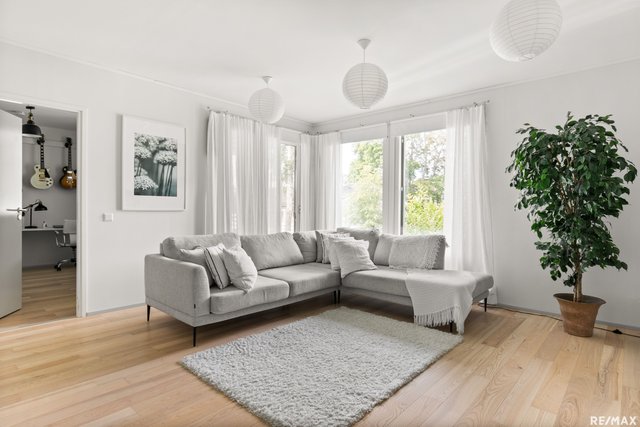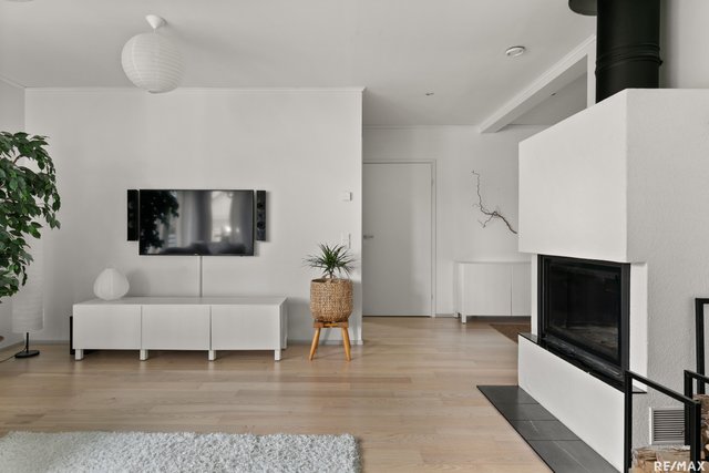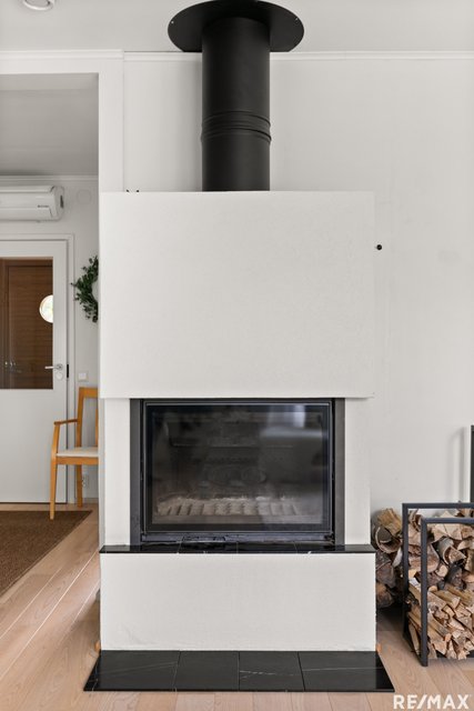 - Valoisa ja moniulotteinen olohuone, jossa tunnelmallinen takka sekä suora kulku terassille ja vehreälle takapihalle.