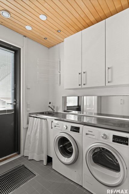 - Tilava ja käytännöllinen kodinhoitohuone jossa erillinen wc sekä sisäänkäynti kuraeteisellä.