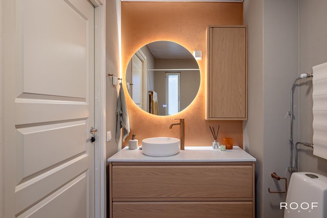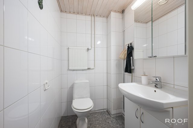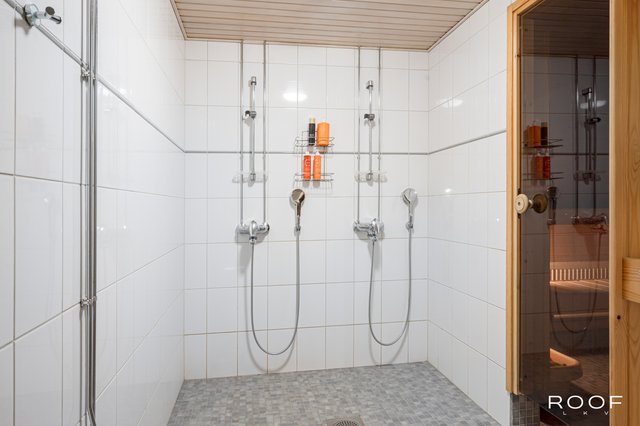- Huoneistossa kaksi kylpyhuonetta. Yläkerran kylpyhuone on saneerattu kokonaisuudessaan vuonna 2025. Yläkerrassa suihku, kylpyamme, tuuletusikkuna, lämpöpatteri, wc-istuin, allas, allaskaappi, valopeili, seinäkaapisto. Alakerran kylpyhuoneessa kaksi suihkua, lämpöpatteri, sisäänkäynti saunatilaan. Lattia yläkerrassa mikrosementtiä ja alakerrassa laattaa. Seinät yläkerran kylpyhuoneessa mikrosementtiä ja alakerrassa laatoitettu. Kylpyhuoneet kokonaisuudessaan ovat raikkaita ja tilavia.