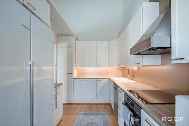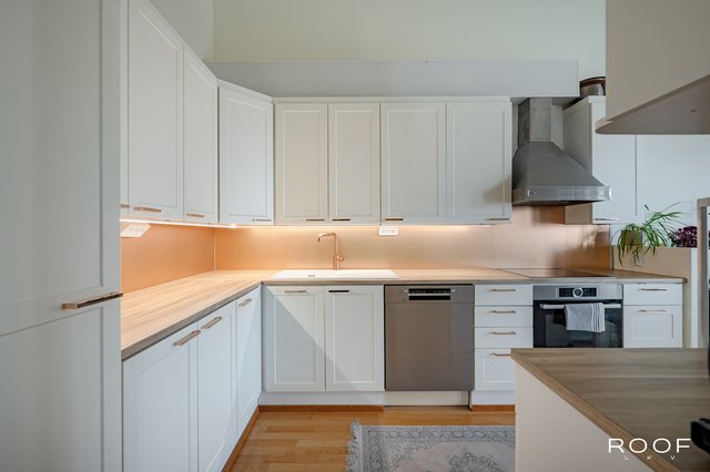 Vuonna 2024 saneerattu keittiö on käytännöllisesti hieman erillään olohuoneesta, mutta silti lähellä. Keittiössä on runsaasti kaappi- ja laskutilaa sekä modernit kodinkoneet – täydellinen paikka ruoanlaittoon ja arjen sujuvuuteen.