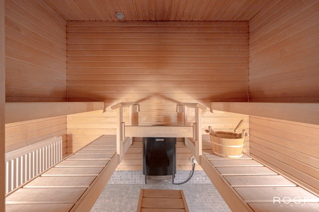 - Tilava sauna sähkökiukaalla. Lattia on laatoitettu, seinät ja katto paneloitu. Lasi ovi.