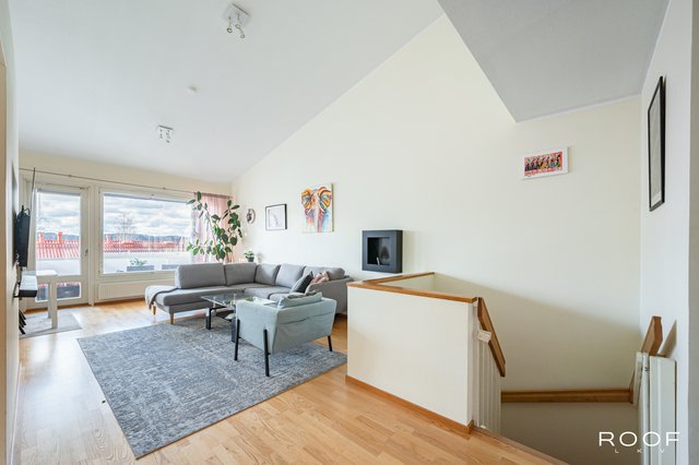- Suuri ja valoisa olohuone, jossa erikoisuutena korkea huonekorkeus. Olohuoneesta uloskäynti tilavalle lasitetulle parvekkeelle. Lattia parkettia, seinät ovat maalattu.
