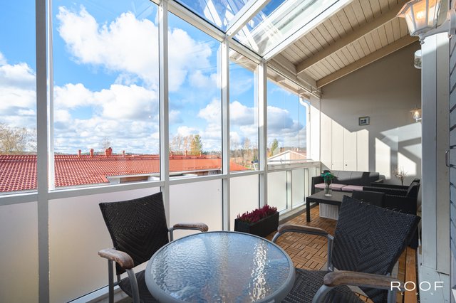 - Tilava yläkerran lasitettu parveke kuin toinen olohuone, josta merikin näkyy. Viihtyisä alakerran terassi, jossa voi grillailla ja chillailla.
