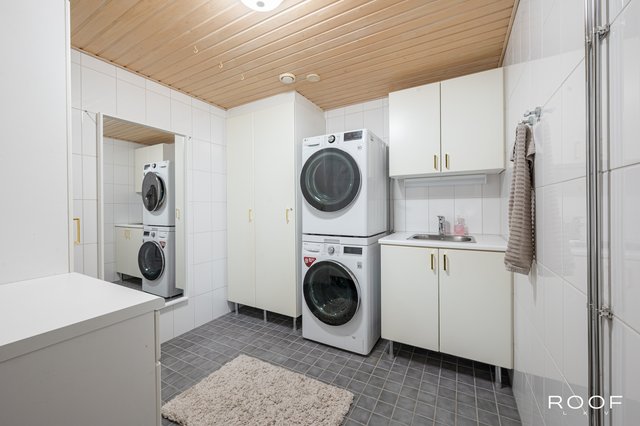 - Suuri ja käytännöllinen kodinhoitohuone, jossa paljon kaappitilaa. Pesukoneliitäntä, allas. allaskaappi. Lattia sekä seinät ovat laatoitettu.