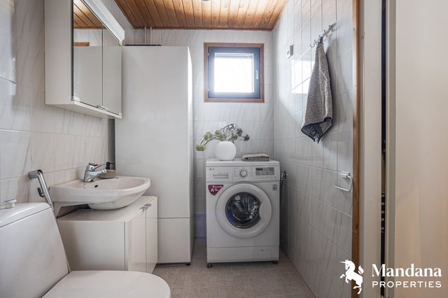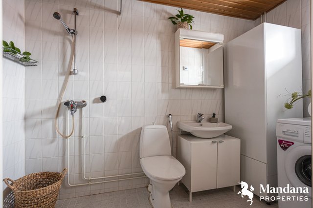 - Varustus: Lämminvesivaraaja, allaskaappi, käsisuihku, pesukoneliitäntä, lattialämmitys (sähköinen), wc-istuin, suihku, peilikaappi, kiinteät valaisimet. Lattia: laatta. Seinät: kaakeli.