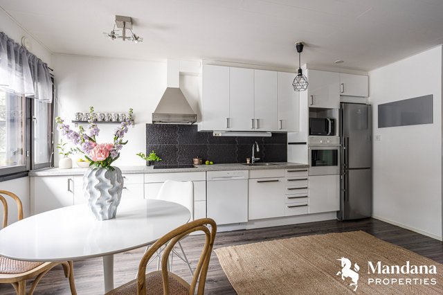 - Keittiö uusittu edellisen asukkaan toimesta noin 2010. Varustus: jääkaappi/pakastin, astianpesukone, kiinteät valaisimet, liesituuletin (hormi), erillisuuni, Liesi: induktio. Työtasot: laminaatti. Lattia: laminaatti. Seinät: maalattu.