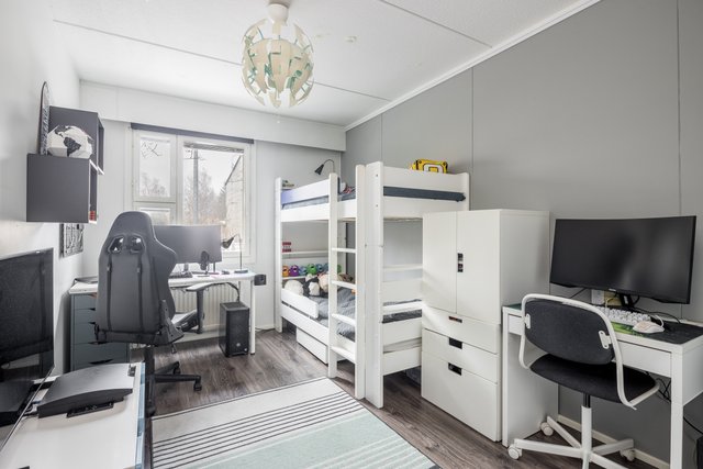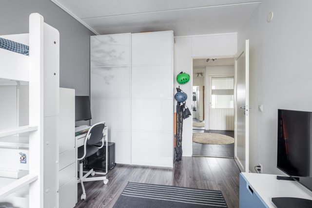 - 1. makuuhuoneessa kaksi kaapistoa, toinen huurrelasiovilla, toinen liukuovikaapisto 2. makuuhuoneessa kiinteä kaapisto, tila työpisteelle.