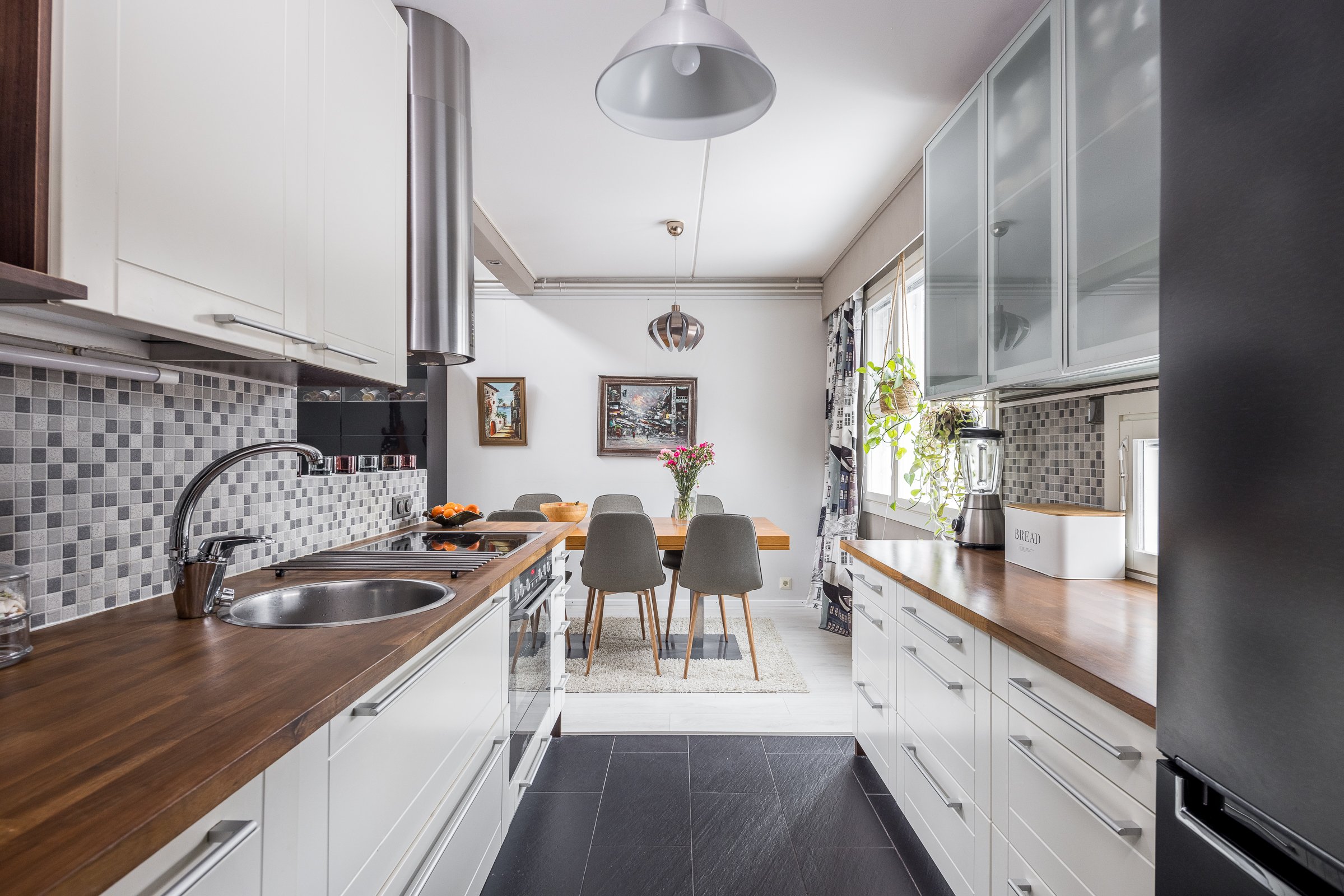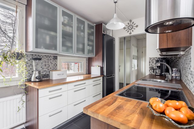 - Osittain avoin keittiö, paikka isommallekin ruokapöydälle, hyvin lasku- ja kaappitilaa.