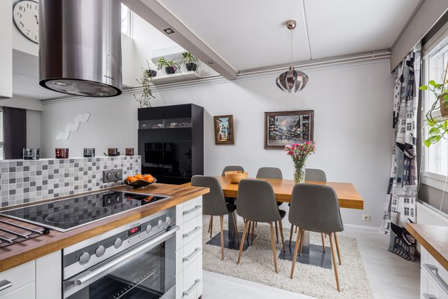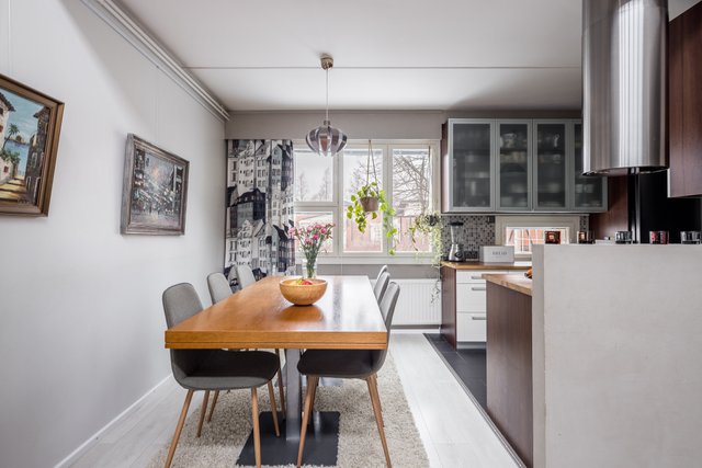 Keittiön ajattomat kaapistot ja työtasot antavat sopivasti säilytys- ja laskutilaa sekä hyvin suunniteltu tila ruokailulle tekee tilasta käytännöllisen.