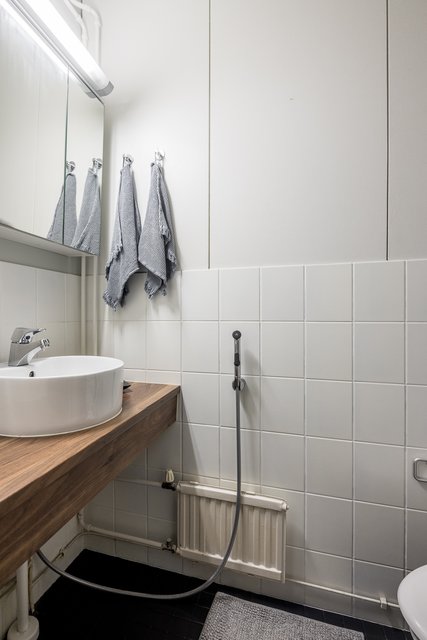 - Suihku, suihkuseinä, pesukoneliitäntä, lattialämmitys (vesikiertoinen), allaskaappi, ja peili