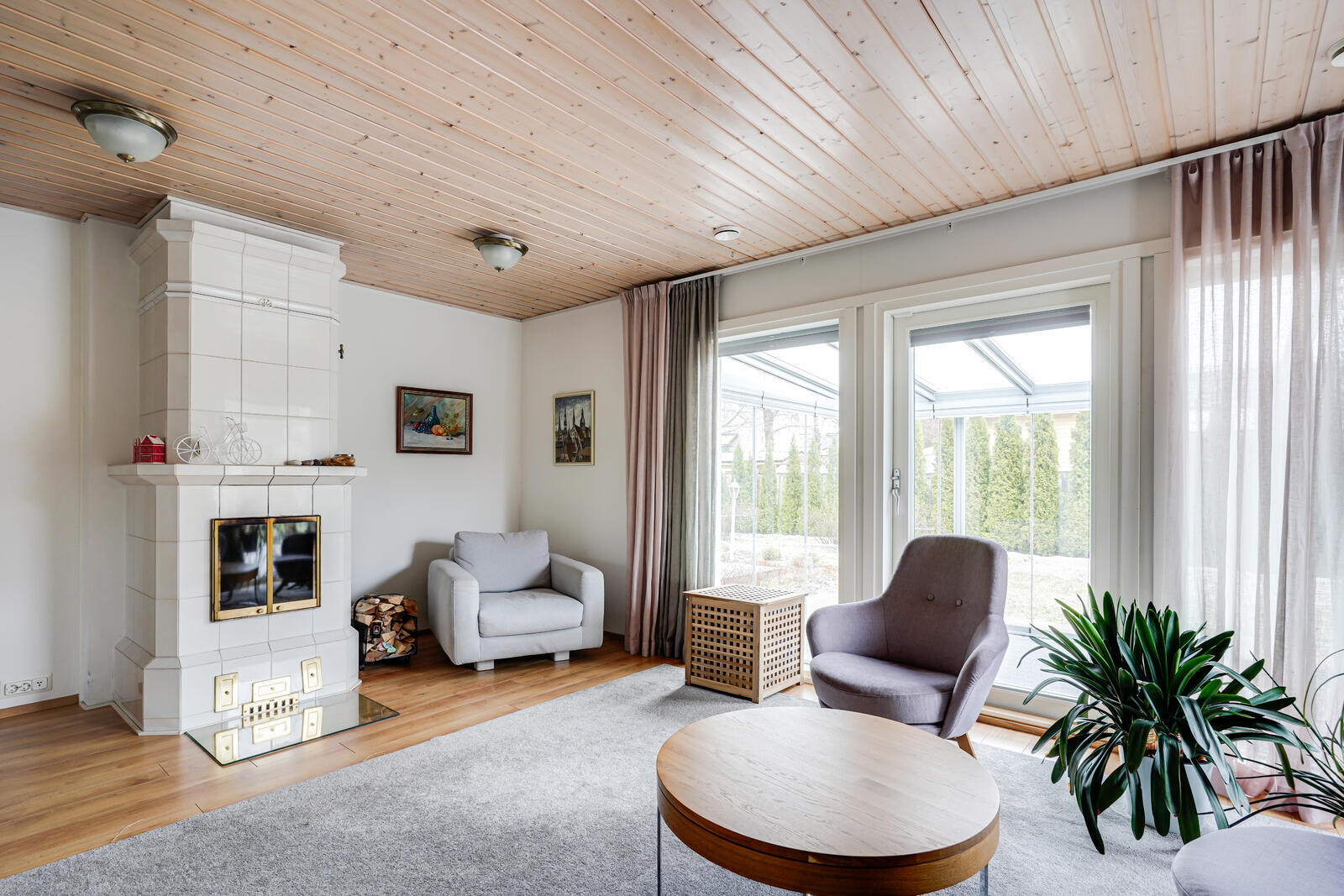 Astuessasi sisään huomaat heti talon avaran tilan tunteen ja valoisan ilmapiirin. Olohuoneen isoista ikkunoista tulvii valoa ja varaavan takan lämpö luo tunnelmaa. Kodin sydän on tyylikäs ja toiminnallinen keittiö, joka on hyvin varusteltu ja tarjoaa runsaasti työskentelytilaa ruoanlaittoa varten. Tilat ovat erityisen muunneltavat, toisessa päädyssä erillinen yksiö omalla sisäänkäynnillä. Makuuhuoneita mahdollista tehdä nykyistä enemmän, tilavia huoneita jakamalla.