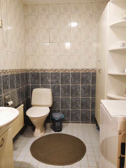 - Tilava wc, jossa korkeat kaapit ja tilaa pyykinpesukoneelle.