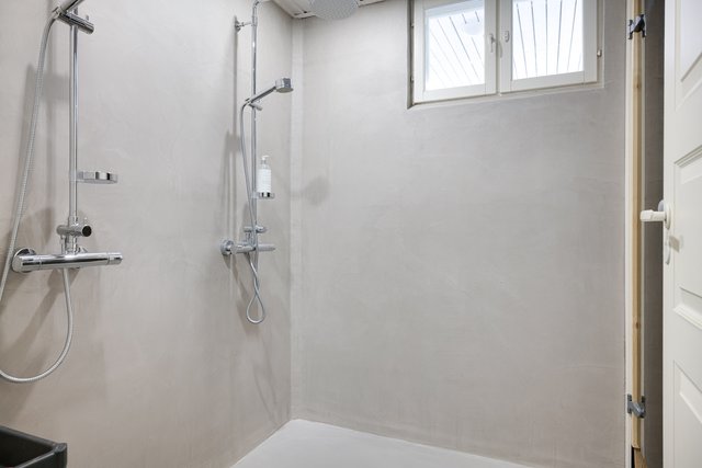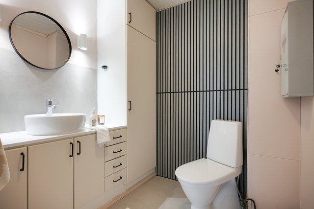 - Kylpyhuoneessa tehty 4/2025 remonttia. Mikrosementti lattiassa sekä seinissä, vanha epox-lattia alla sekä seinäkaakelit. Kylpyhuoneen yhteydessä on pukuhuone + wc, joihin on molempiin remontin yhteydessä laitettu mikrosementti lattiaan. Pukuhuoneessa seinä puolipaneeli ja tapetti.