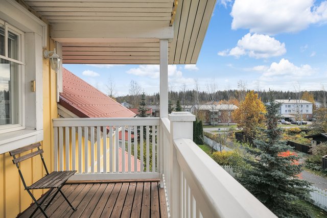 Ylimmässä kerroksessa sijaitsee kolme tilavaa makuuhuonetta, vaatehuone, erillinen wc, jossa myös suihkukaappi sekä tilava aulatila, josta pääsee kerroksen parvekkeelle nauttimaan auringosta.