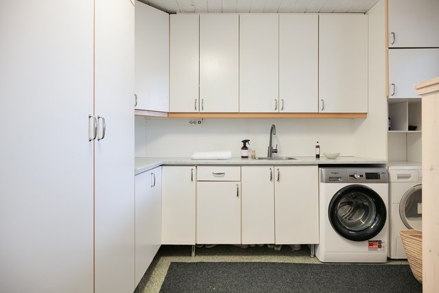 - Pesukoneliitäntä, lattiakaivo (x 2), pesuallas, pöytätaso, lattialämmitys (vesikiertoinen), pyykkikaapit, ja kaapistoja
